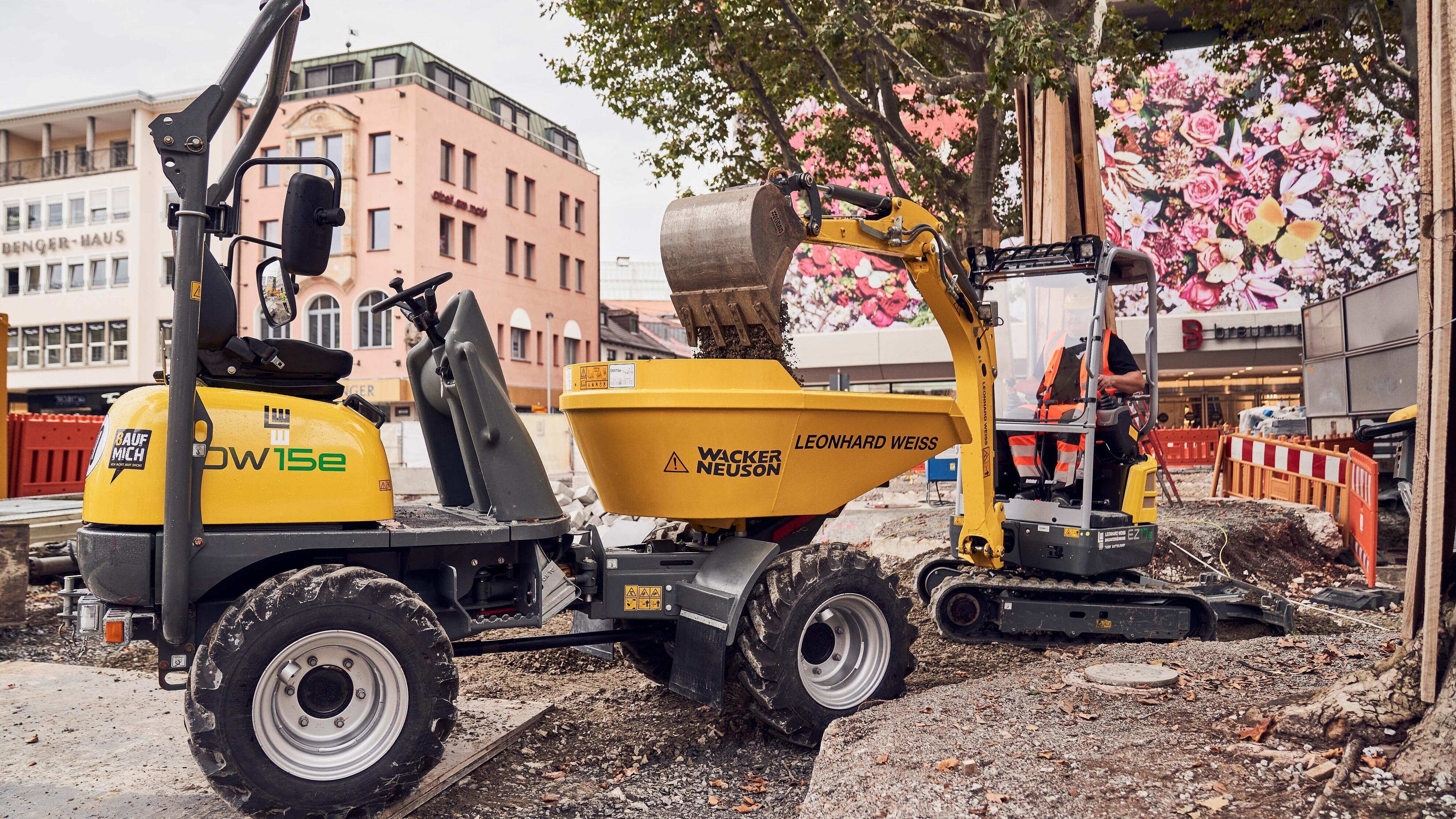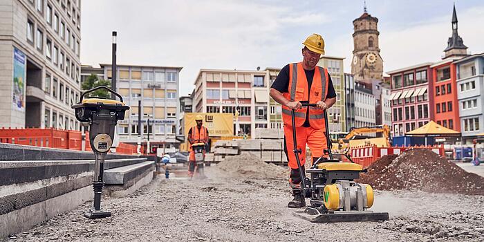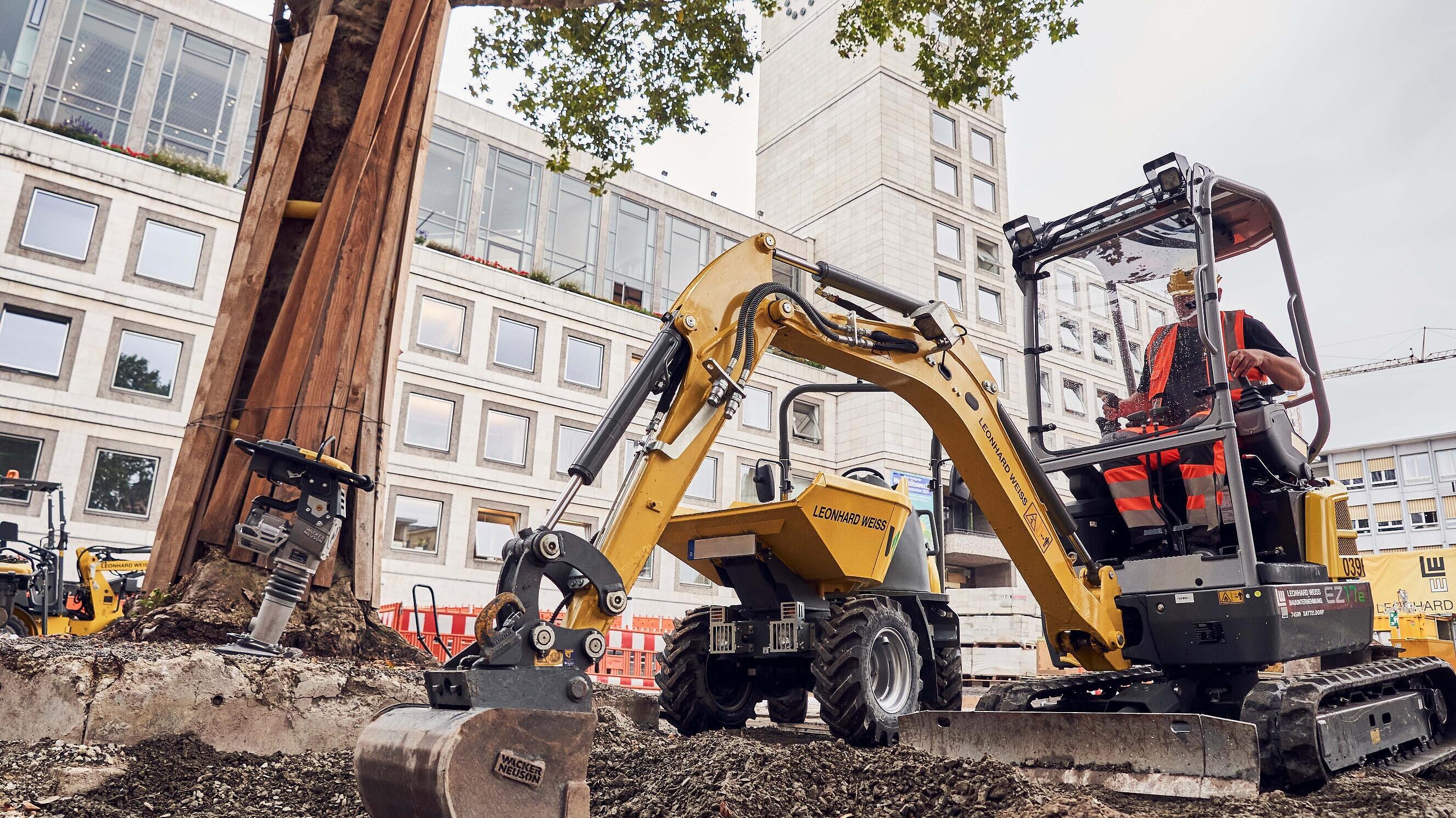 Para la compactación del suelo en la obra de Stuttgart se utilizaron, por ejemplo, los ya probados apisonadores a batería, que llevan en el mercado desde 2015, y planchas vibratorias a batería, algunas de las cuales pertenecen a la nueva serie APS. El dumper sobre orugas DT10e, el dumper sobre ruedas DW15e y la cargadora sobre ruedas WL20e permiten transportar material de manera eficiente sin emisiones directas de gases de escape y con unas emisiones de ruido extremadamente bajas. La excavadora sin sobresaliente trasera Zero Tail EZ17e se utilizó para trabajos de excavación y demolición. Con la tecnología de iones de litio de alta calidad, la máquina cumple con las elevadas exigencias en cuanto al rendimiento, la durabilidad y la robustez.