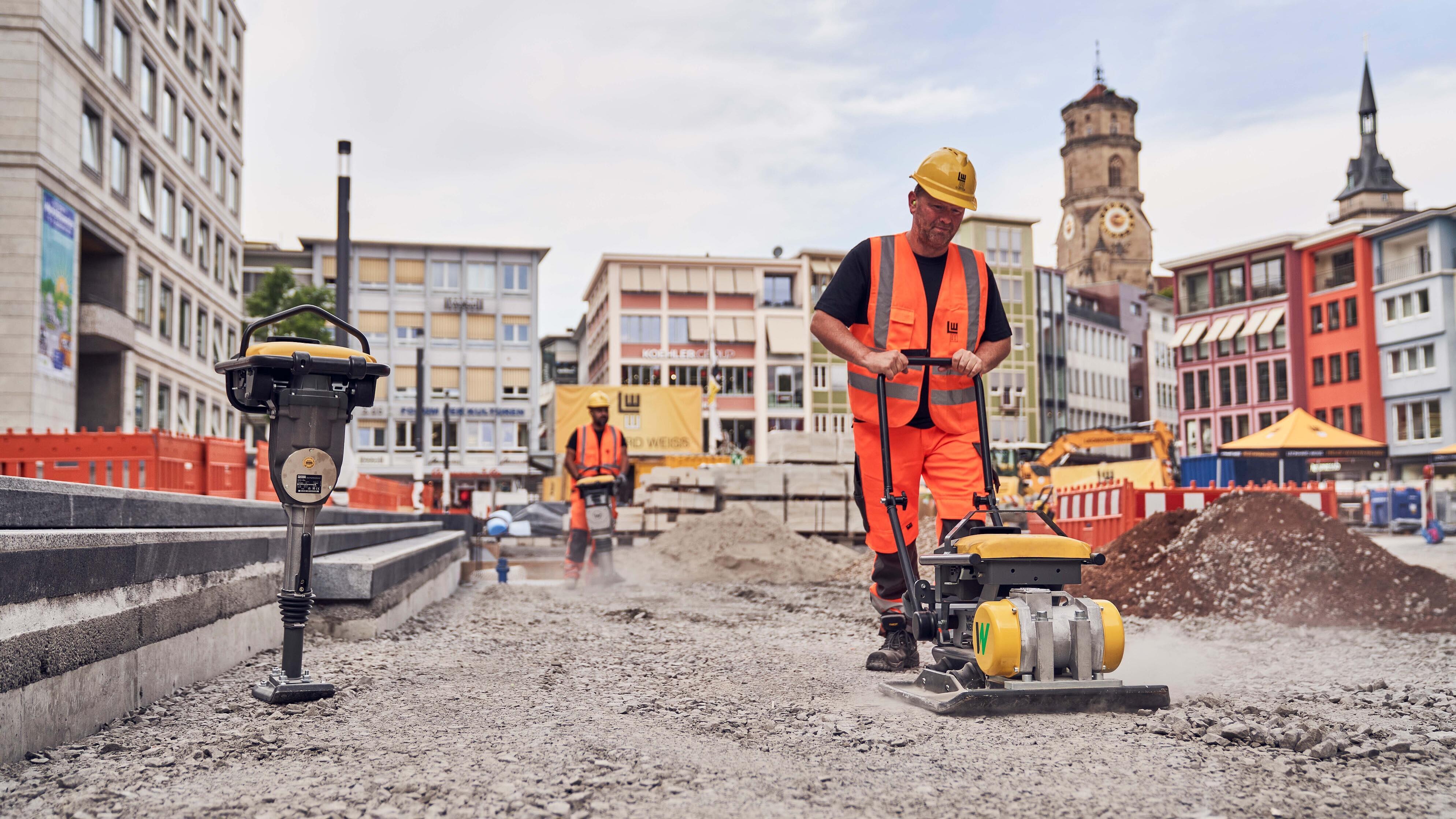 LEONHARD WEISS probó toda la gama zero emission de Wacker Neuson en el transcurso de las obras de rehabilitación de la plaza del mercado de Stuttgart en el centro de la ciudad. «Nos gusta mucho el hecho de que las máquinas y los equipos para la construcción eléctricos tengan el mismo rendimiento que los modelos convencionales», señala Simon Schall, jefe de ingeniería mecánica central de LEONHARD WEISS. «Durante la puesta en marcha diaria, hay menos puntos de mantenimiento que con los equipos con motor de combustión interna, de modo que el conductor o el operador pueden acceder a la máquina con mayor facilidad».