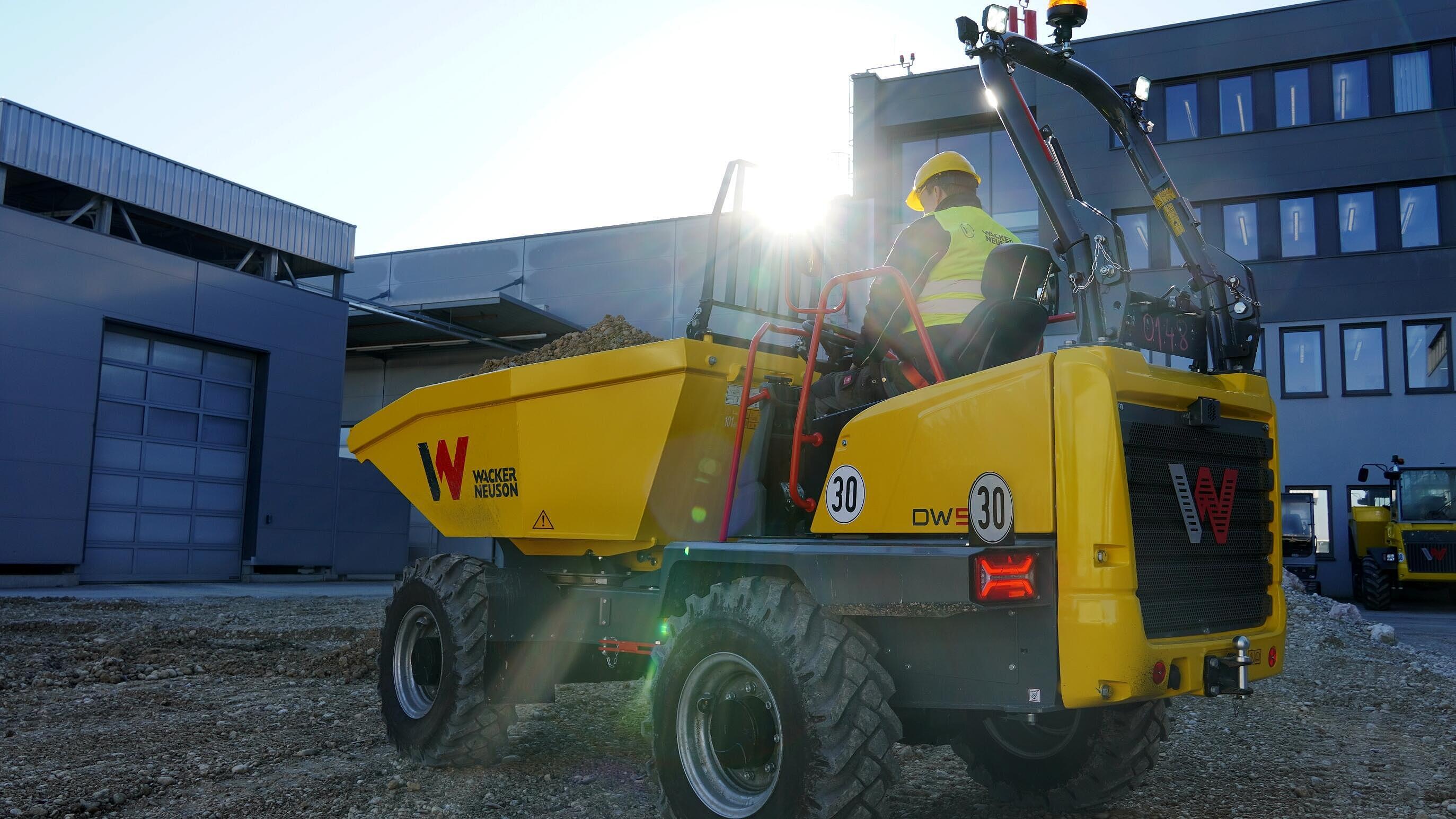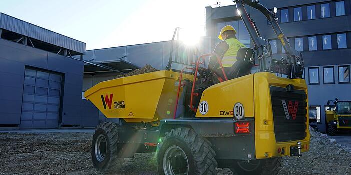 El dumper sobre ruedas DW50 ha sido optimizado en cuanto a seguridad, rendimiento y confort. Una variedad de nuevos detalles convierten a esta máquina en un ayudante seguro en el transporte de materiales: la función Hillhold evita que la máquina retroceda cuando se detiene en una pendiente. Asimismo, el control del cinturón de seguridad también requiere que el operador se abroche el cinturón para poder arrancar la máquina. La forma optimizada de la caja de volteo ofrece un mayor volumen y reduce el riesgo de daños al mínimo durante la carga con una cuchara de excavadora. Además, la máquina dispone de protección contra un llenado excesivo del depósito, asientos con calefacción, control limitador de velocidad, como también un display grande y claro, características de seguridad como cámaras en ambos sentidos de la marcha y luces traseras LED con intermitentes dinámicos. Otras características de la máquina incluyen la función de parada automática de serie: apaga la máquina automáticamente tras un período de tiempo predefinido sin usarse. Los consumidores eléctricos que no son relevantes para la seguridad también se apagan para ahorrar batería en la máquina. Las ventajas son una reducción de los costes operativos, un aumento de los intervalos de mantenimiento y un mayor valor de reventa de la máquina. La probada dirección hidrostática a las cuatro ruedas garantiza que la máquina acelere de forma uniforme hasta 30 km/h.