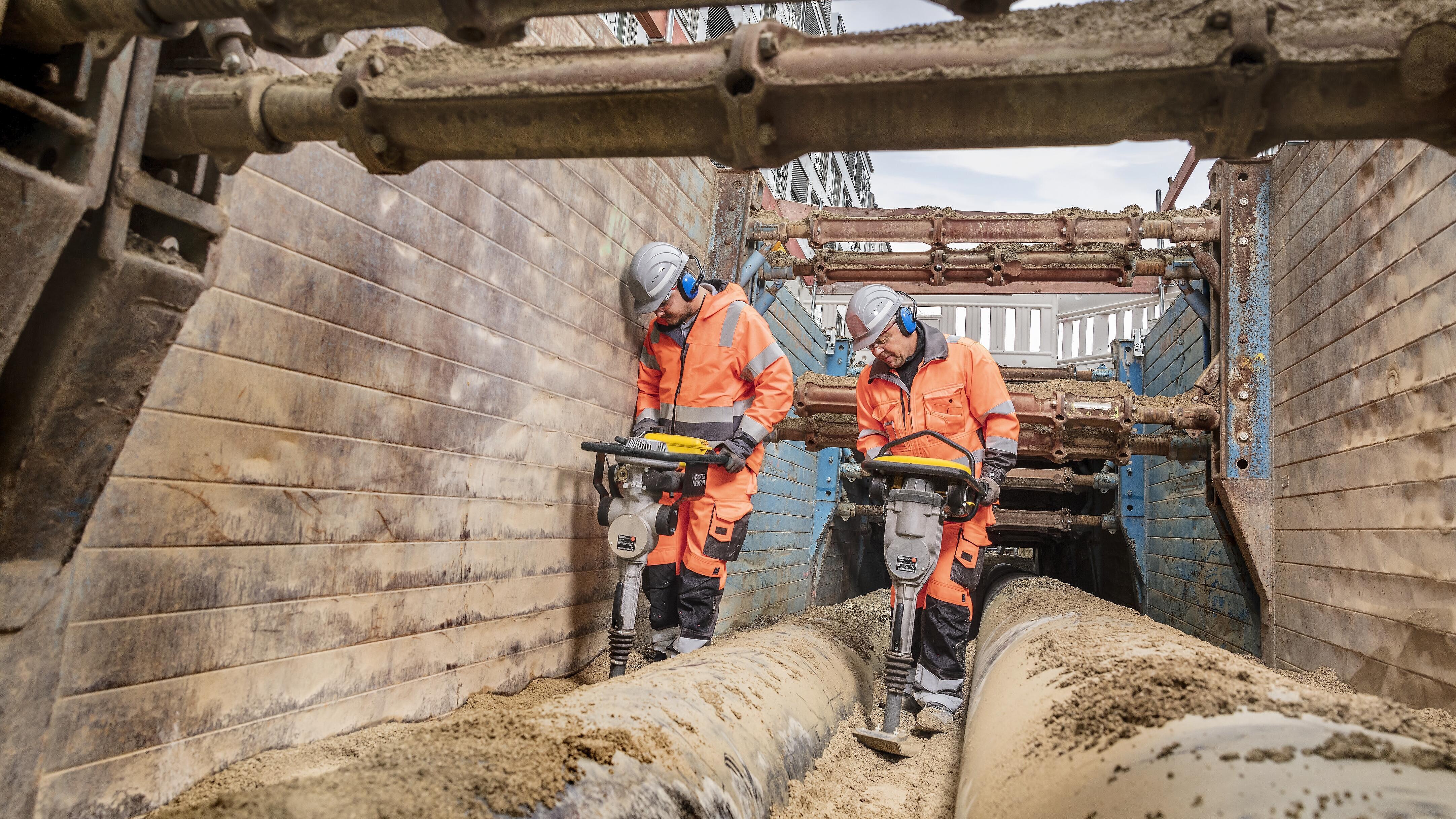 Los apisonadores de Wacker Neuson pudieron desplegar todas sus ventajas al máximo en los estrechos espacios de la obra: como equipos flexibles y potentes, eran ideales para los trabajos de entibación de las zanjas y se usaban tanto para compactar el material en las bifurcaciones de las tuberías como en los laterales. Además de los apisonadores convencionales de cuatro tiempos, también se utilizaron varios modelos de apisonadores de dos tiempos. Además, en los trabajos de compactación en las zanjas, los apisonadores a batería destacaron por su forma de trabajar sin emisiones, ya que protege a los operadores y las personas que se encuentran en el entorno de la obra de las emisiones de gases de escape.