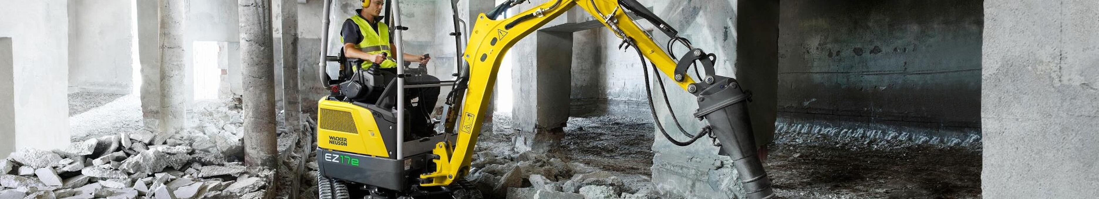 Wacker Neuson zero tail excavator EZ17e in application on a construction site in the city.